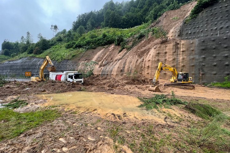 Bölgeye sevk edilen karayolları ekipleri, heyelanın ardından yolu kaplayan toprak ve ağaç parçalarını iş makineleriyle kaldırıyor.