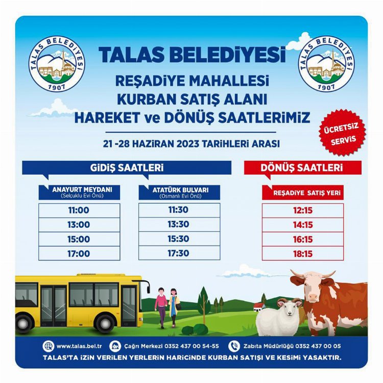 Kayseri Talas Belediyesi, Kurban Bayramı’na özel, kurban satış ve kesim yerlerine ücretsiz servis düzenliyor.