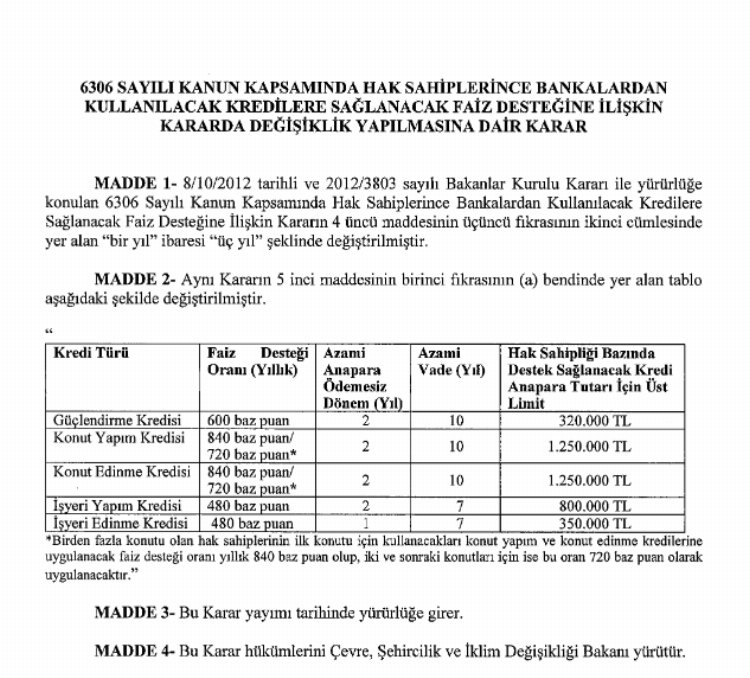 Çevre, Şehircilik ve İklim Değişikliği Bakanlığı'nca yürütülen kararda yapılan düzenlemeyle yapım, edinme ve güçlendirme kredilerine faiz desteği sağlanması için tahliye veya yıkım tarihinden itibaren kredi sağlayacak bankalara başvuruda süre sınırı 1 yıldan 3 yıla yükseltildi.