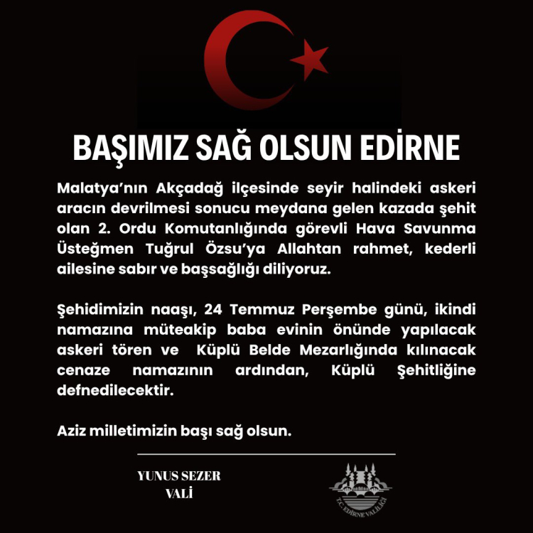 Milli Savunma Bakanlığı, Malatya’da meydana gelen askeri aracın devrilmesi sonucu meydana gelen kazada Hava Savunma Üsteğmen Tuğrul Özsu’nun şehit olduğunu duyurdu. Bakanlık, şehide rahmet, ailesine ve millete başsağlığı diledi. Şehit Özsu, bugün ikindide Edirne'de toprağa verilecek