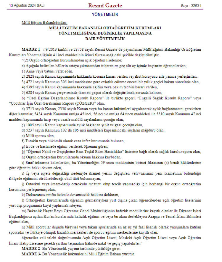 Buna göre, örgün ortaöğretim kurumlarından açık öğretim liselerine, belirtilen hâllerin ortaya çıkmasından itibaren en geç 6 ay içinde başvuran öğrencilerin veli talebi doğrultusunda Açık Öğretim Lisesi, Mesleki Açık Öğretim Lisesi veya Açık Öğretim İmam Hatip Lisesine nakil ve geçiş yapabileceği belirtildi.