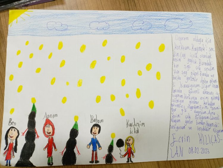Depremle sallanan ve sokaklara çıkan Kayserili vatandaşlara ilk andan itibaren kucak açarak barınma imkânı sağlayan Kayseri Büyükşehir Belediyesi, tesislerinde konuk olan minik misafirleri tarafından da teşekkür aldı. Büyükşehir Belediyesi KAYMEK A.Ş. Akademi Tesisleri’nde misafir olan minik Ecrin Kılıçaslan, yaptığı resmin yanına yazdığı yazıda duygu ve düşüncelerini paylaşarak Büyükşehir Belediyesi KAYMEK’e teşekkür etti. Minik Ecrin, duygu dolu yazısında şunlara yer verdi:
