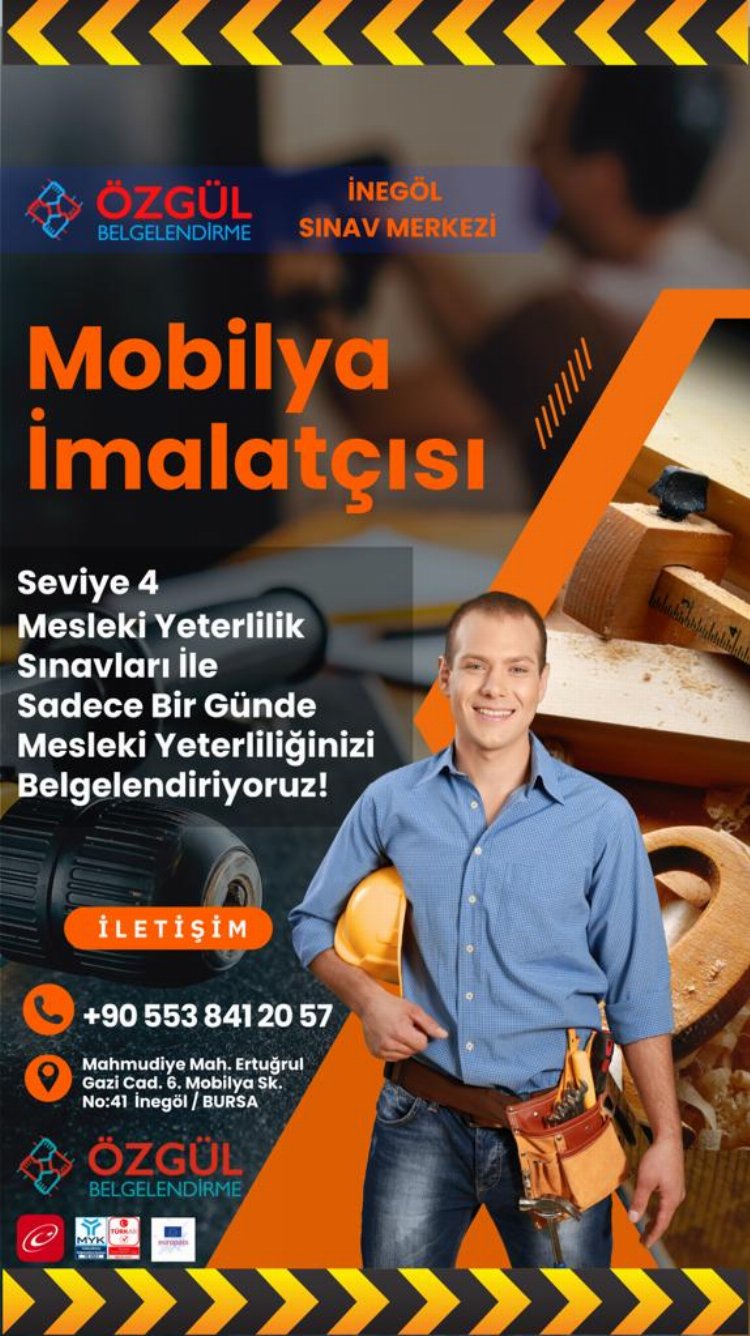 Hem mobilya imalatı, hem de döşemede çalışanlar mesleki yeterlilik belgesi almaları zorunlu hale geldi. Mobilya Mesleki Yeterlilik Belgesi için yetki alan ilk kuruluş Bursa İnegöl'den Özgül Belgelendirme oldu.