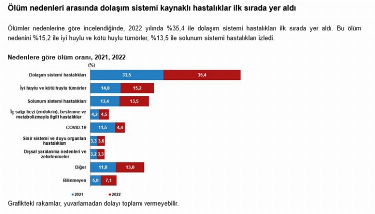Ölümler nedenlerine göre incelendiğinde, 2022 yılında yüzde 35,4 ile dolaşım sistemi hastalıkları ilk sırada yer aldı. Bu ölüm nedenini yüzde 15,2 ile iyi huylu ve kötü huylu tümörler, yüzde 13,5 ile solunum sistemi hastalıkları izledi.