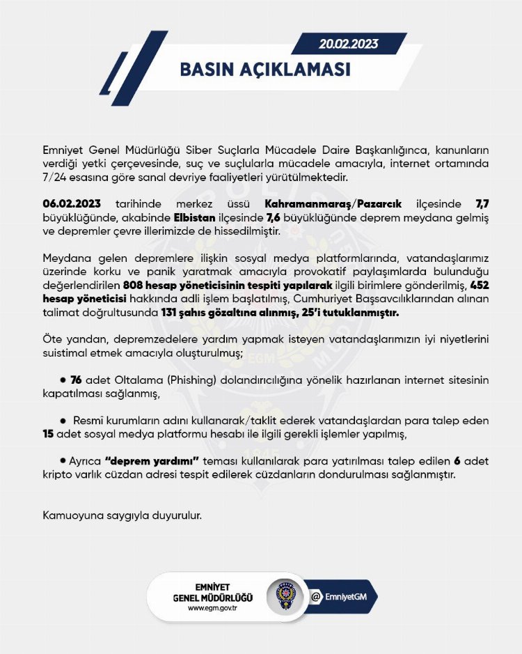 Depremzedelere yardım yapmak isteyenleri hedef alan 76 oltalama (phishing) dolandırıcılığına yönelik internet sitesinin kapatıldığı belirtilerek, "Resmi kurumların adını kullanarak, taklit ederek vatandaşlardan para talep eden 15 adet sosyal medya platformu hesabı ile ilgili gerekli işlemlerin yapıldığı" vurgulandı.