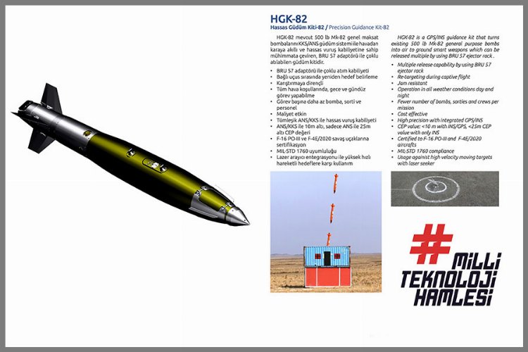 Bakanlığın resmi internet sitesinde yer alan habere göre, BRU 57 adaptörü ile çoklu atılabilen bir güdüm kiti olan HGK-82’in mevcut güdümsüz genel maksat bombalarına hassas vuruş yeteneği kazandırdığını anlatan Kacır, “Her türlü hava koşulunda kullanılabilen, gece ve gündüz ayrımı olmadan hareketli nesneleri vurabilen bir mühimmattan bahsediyoruz. Milli imkanlarla geliştirilen ve üretilen HGK-82 sistemi, savunma sanayisinde tam bağımsızlık iddiamız açısından oldukça önemli. Milli Teknoloji Hamlesi ile ülkemizde son dönemde savunma sanayisinin millileşmesine yönelik yapılan çalışmaların neticelerini en güzel şekilde almaya devam edeceğiz.” dedi.