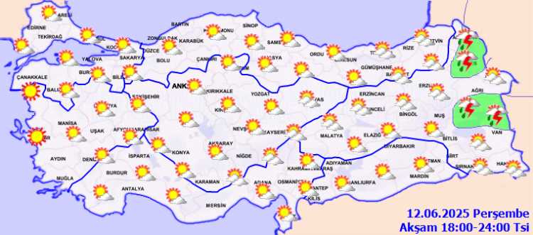 ANKARA (İGFA) - Meteoroloji Genel Müdürlüğü 12 Haziran Perşembe ilişkin hava raporunu yayımladı.