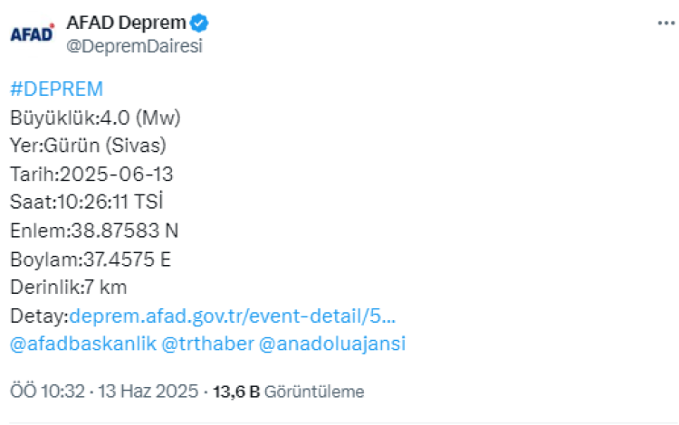 ANKARA (İGFA) - AFAD verilerine göre, merkez üssü Sivas'ın Gürün ilçesi olan 4 büyüklüğünde deprem kaydedildi.