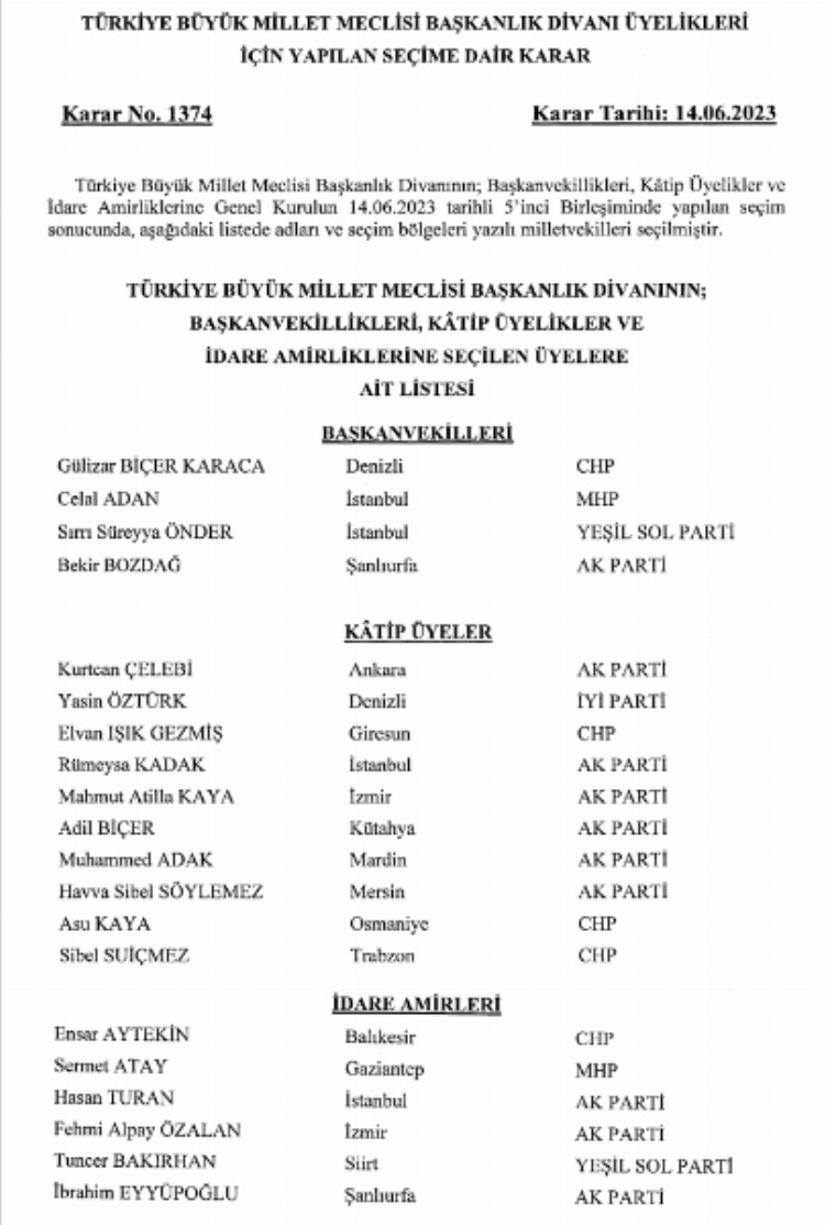 TBMM Başkanlık Divanı'nın başkanvekillikleri, katip üyelikler ve idare amirliklerine Genel Kurulun 14 Haziran tarihli 5'inci birleşiminde yapılan seçim sonucunda seçilen üyelerin listesi Resmi Gazete'de yayımlandı.