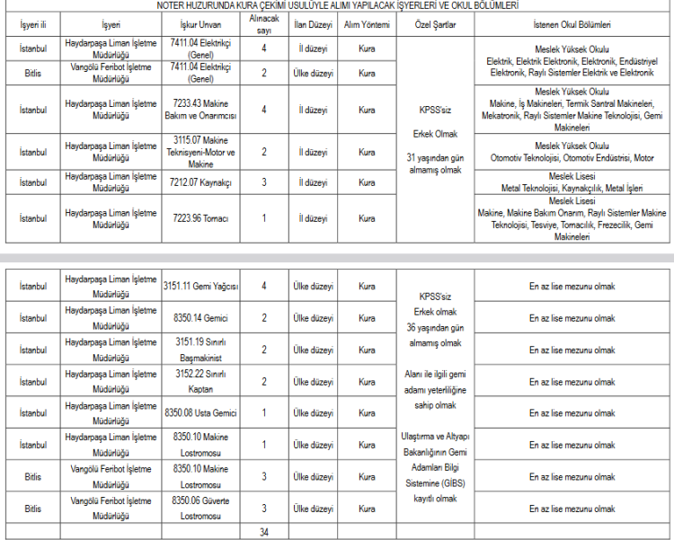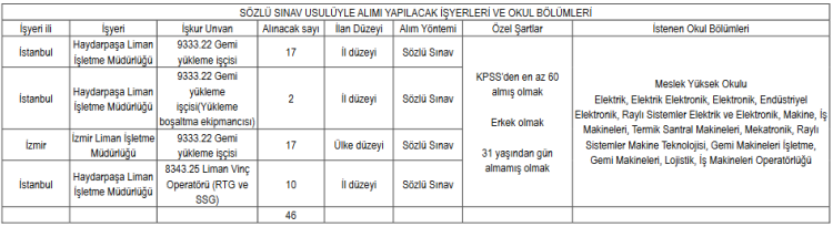 Türkiye Cumhuriyeti Devlet Demiryolları (TCDD); İzmir Liman İşletme Müdürlüğü, Haydarpaşa Liman İşletme Müdürlüğü ve Vangölü Feribot Müdürlüğüne belirsiz süreli iş sözleşmesiyle sözlü sınav usulüyle 46, noter huzurunda kura çekimi ile 34 olmak üzere 80 işçi alınacağını duyurdu.