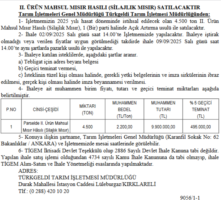 Tarım İşletmeleri Genel Müdürlüğü (TİGEM) Türkgeldi Tarım İşletmesi, 2025 yılı hasat döneminde üretilen 4 bin 500 ton II. Ürün Mahsul Mısır Hasılı’nı (Silajlık Mısır) açık artırma usulüyle satışa çıkaracağını duyurdu. İhale, 2 Eylül 2025’te Lüleburgaz’da gerçekleştirilecek.