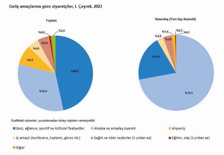 Bu çeyrekte ziyaretçiler Türkiye'yi yüzde 46,6 ile en çok "gezi, eğlence, sportif ve kültürel faaliyetler" amacıyla ziyaret ederken, ikinci sırada yüzde 32,4 ile "akraba ve arkadaş ziyareti", üçüncü sırada ise ile yüzde 8,5 ile "alışveriş" yer aldı. Yurt dışı ikametli vatandaşlar ise ülkemize yüzde 72,1 ile en çok "akraba ve arkadaş ziyareti" amacıyla geldi.