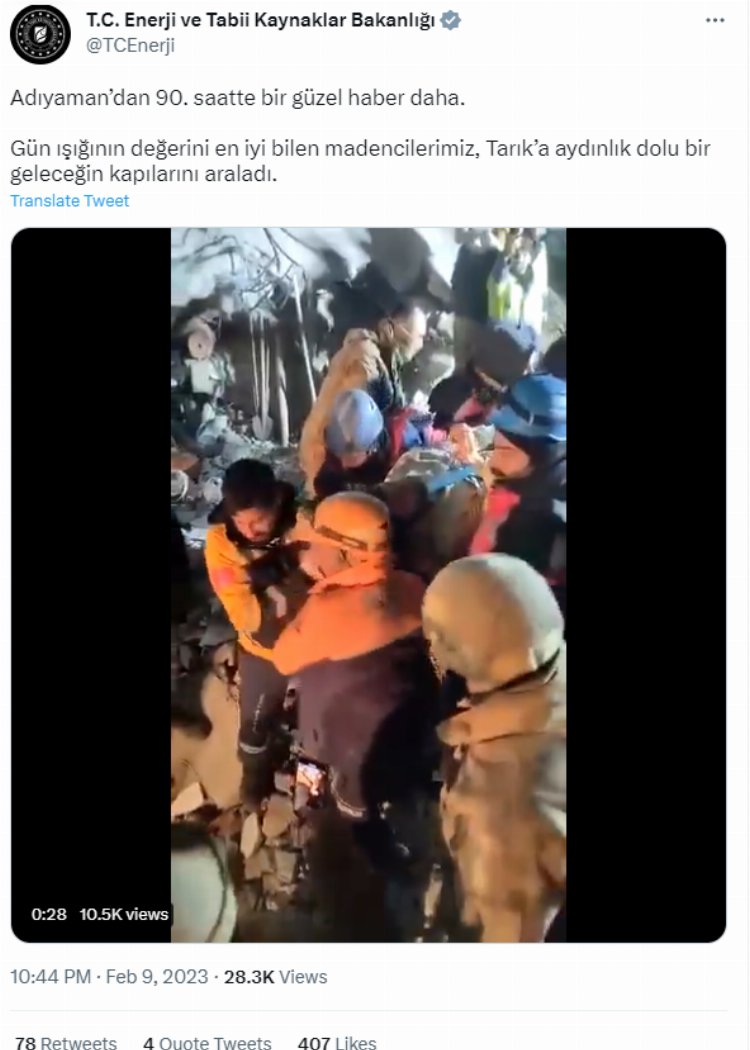 T.C. Enerji ve Tabii Kaynaklar Bakanlığı 9 Şubat’ta “Adıyaman’dan 90. saatte bir güzel haber daha. Gün ışığının değerini en iyi bilen madencilerimiz, Tarık’a aydınlık dolu bir geleceğin kapılarını araladı.” şeklinde paylaşım yaparken, Enerji ve Tabii Kaynaklar Bakan Yardımcısı Prof. Dr. Şeref Kalaycı ise “An itibarıyla 9782 kahraman madenci deprem bölgesinde arama kurtarma çalışmalarında aktif görev alıyor. Allah hepsinden razı olsun.” şeklinde bilgi verdi.