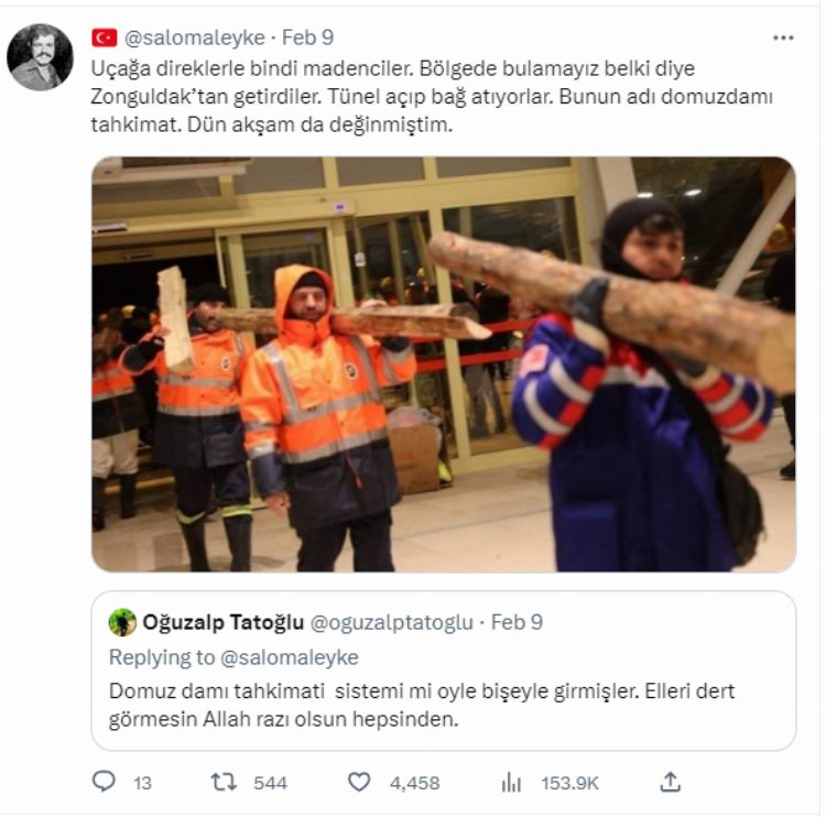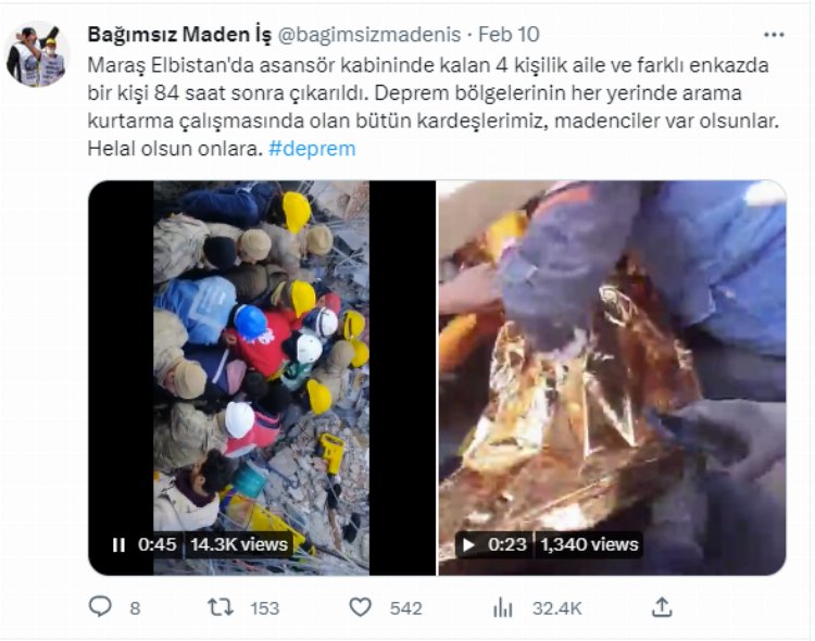 Hatay’da madencilerimiz 110 saat sonra bir anne ve bebeğini enkazdan kurtardı. Adıyaman'da 152’inci saatin sonunda arama kurtarma ve madenciler biri kadın, biri çocuk, iki kardeşi sağ olarak çıkardı. Elbistan’da 4 kişi sağ olarak Somalı madenciler tarafından kurtarıldı, Rize’den katılan madenciler Kahramanmaraş’ta biri bebek 11 kişiyi kurtardı. İzmirli madenciler, 107 ve 127 saat boyunca enkaz altında kalan iki kişiyi kurtararak, bir mucizeyi gerçekleştirmiş oldu. Bu örnekler sadece birkaçı…