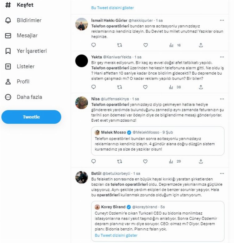 “Bu felaketin sonrasında en büyük hayal kırıklığı yaratan şirketlerden bazıları da telefon operatörleri oldu. Depremzede yakınlarımıza güçlükle ulaşıyoruz. Aynı şekilde yardım ekipleri de benzer sorunlar yaşıyor. Hala bu operatörleri kullanmak zorunda olduğum için utanıyorum.”
