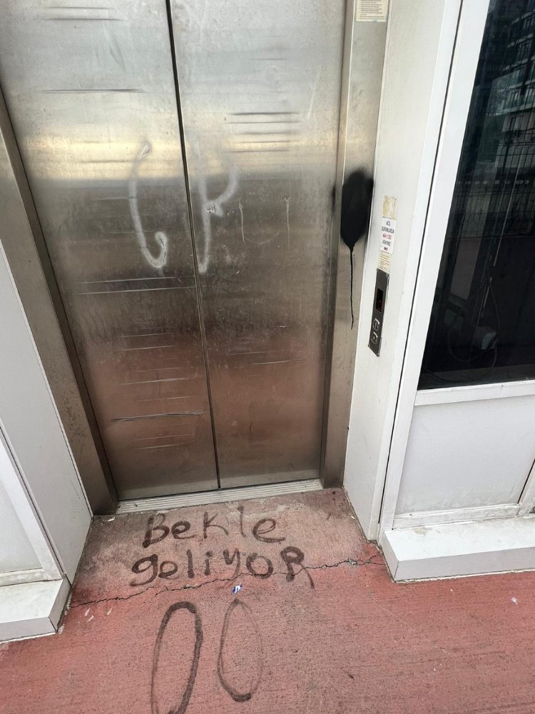 Kendini bilmez kişi ya da kişiler, şehidimiz Polat Özbek’in adını taşıyan üst geçidin asansörlerine sprey boya ile yazdıkları yazı ve çizimlerle saldırıda bulundu