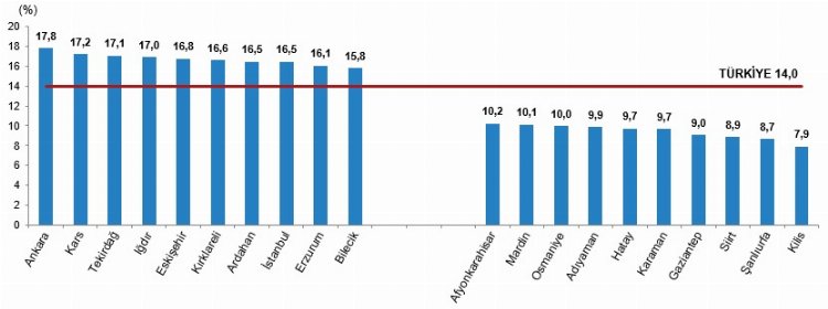 Dolaşım sistemi hastalıklarına bağlı ölüm oranının en düşük olduğu il ise yüzde 26,1 ile Kayseri oldu. Bu ili yüzde 27,4 ile İstanbul, yüzde 27,6 ile Kocaeli, yüzde 28,3 ile Muş ve Eskişehir izledi.