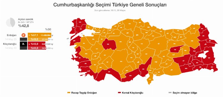 Anadolu Ajansı'nın verilerine göre açılan sandık oranı yüzde 35,18'deyken Recep Tayyip Erdoğan'ın oy oranı yüzde 58; Kemal Kılıçdaroğlu'nun oy oranıysa yüzde 42.