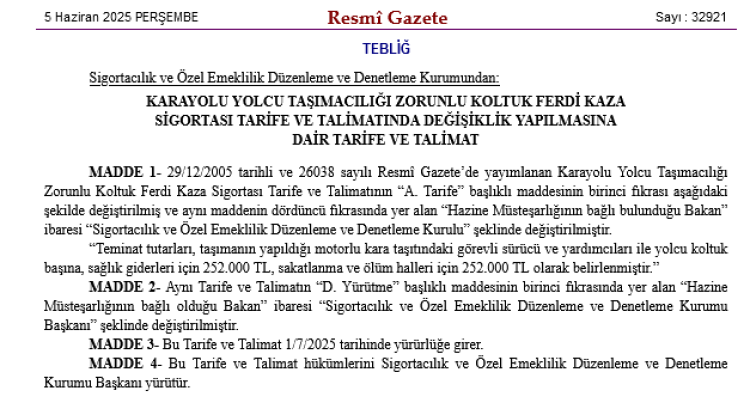 ANKARA (İGFA) - Resmi Gazete’de yayımlanan “Karayolu Yolcu Taşımacılığı Zorunlu Koltuk Ferdi Kaza Sigortası Tarife ve Talimatında Değişiklik Yapılmasına Dair Tarife ve Talimat” ile sigorta teminatlarında güncelleme yapıldı.