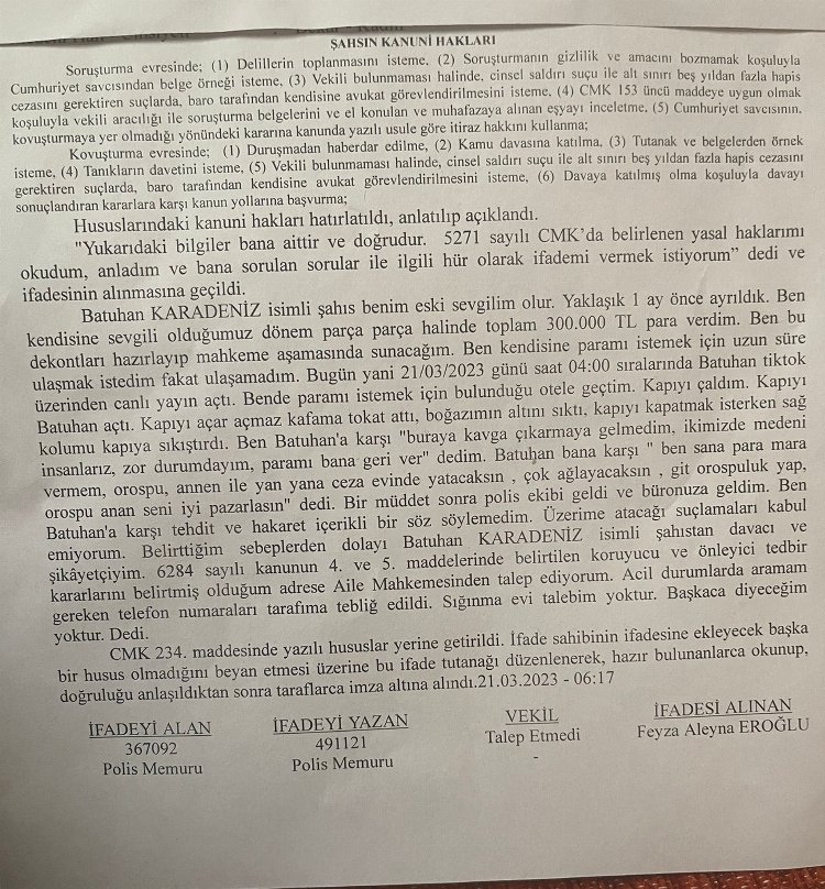 Futbolcudan davacı olan Aleyna Eroğlu, futbolcuya verdiği 300 bin lirayı istediğini bunun karşılığında darp edildiğini ve her türlü rapor ve ispatla avukatıyla dava açmak için işlemlere başladıklarını vurguladı.