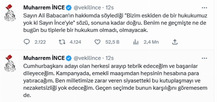 Muharrem İnce, paylaşımında, "Sayın Ali Babacan'ın hakkımda söylediği "Bizim eskiden de bir hukukumuz yok ki Sayın İnce'yle" sözü, sonuna kadar doğru. Benim ne geçmişte ne de bugün bu tiplerle bir hukukum olmadı, olmayacak" ifadelerini kullandı.