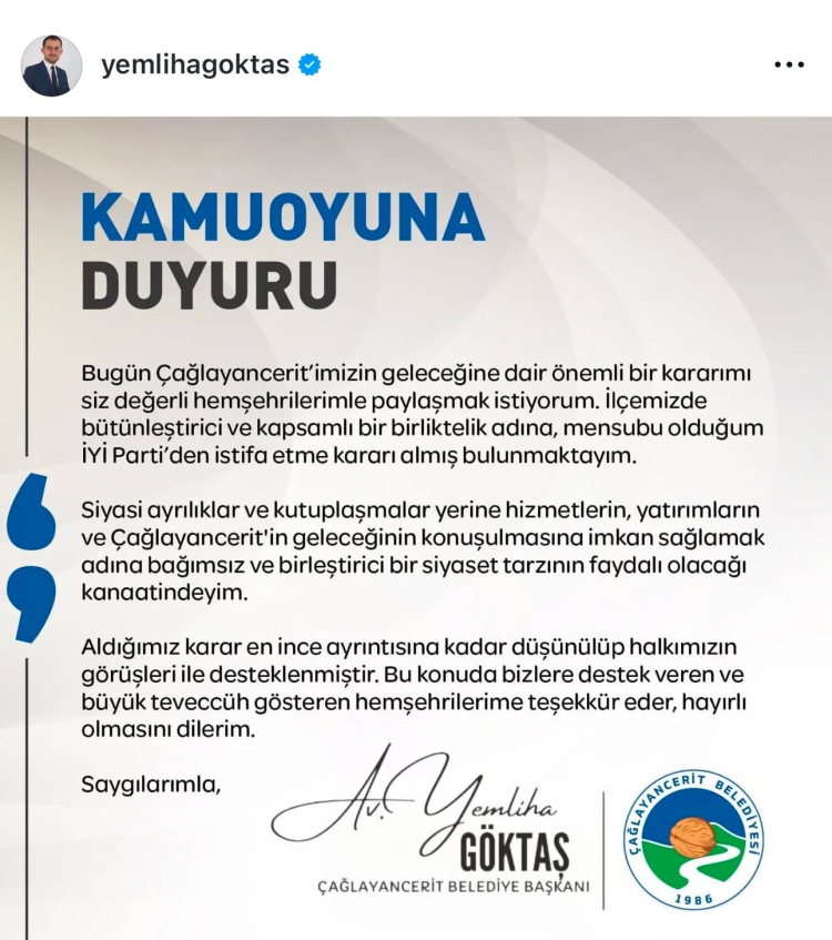 Kahramanmaraş'ta Çağlayancerit Belediye Başkanı Yemliha Göktaş, yaptığı yazılı açıklama ile İYİ Parti’den istifa etti.