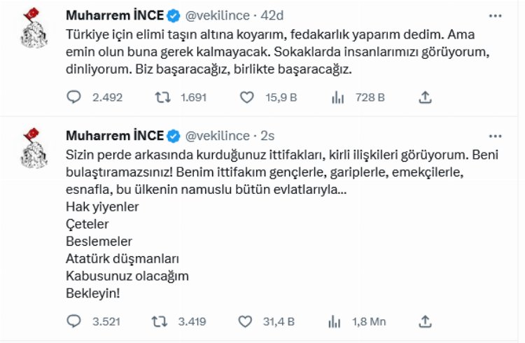 İnce, yaptığı son paylaşımında ise, "Türkiye için elimi taşın altına koyarım, fedakarlık yaparım dedim. Ama emin olun buna gerek kalmayacak. Sokaklarda insanlarımızı görüyorum, dinliyorum. Biz başaracağız, birlikte başaracağız" vurgusu yaptı.