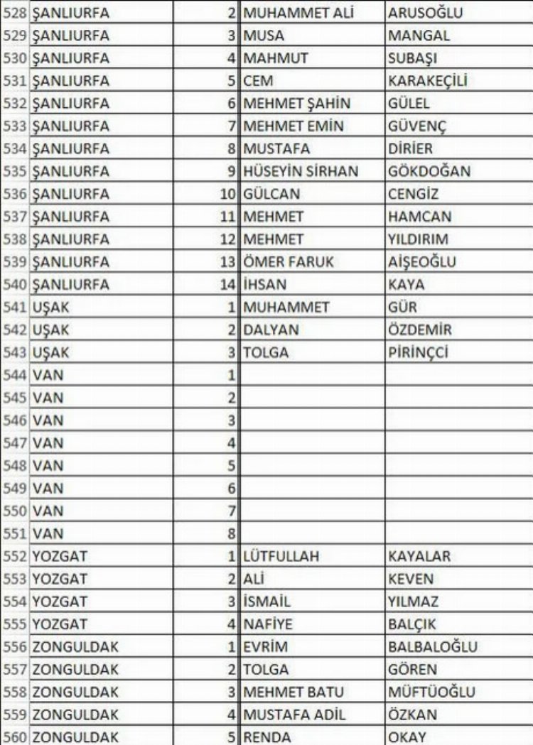 TESLİM EDİLEN ADAY LİSTESİNE GÖRE İL İL ADAYLAR ŞÖYLE