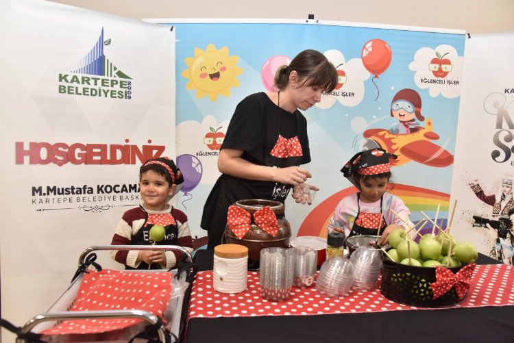 Kartepe Belediyesi Kültür ve Sosyal İşler Müdürlüğü tarafından düzenlenen etkinlikte minikler şarkılar eşliğinde eğlenirken, kendi elleriyle hazırladıkları çikolatalı elma şekerlerini yediler.