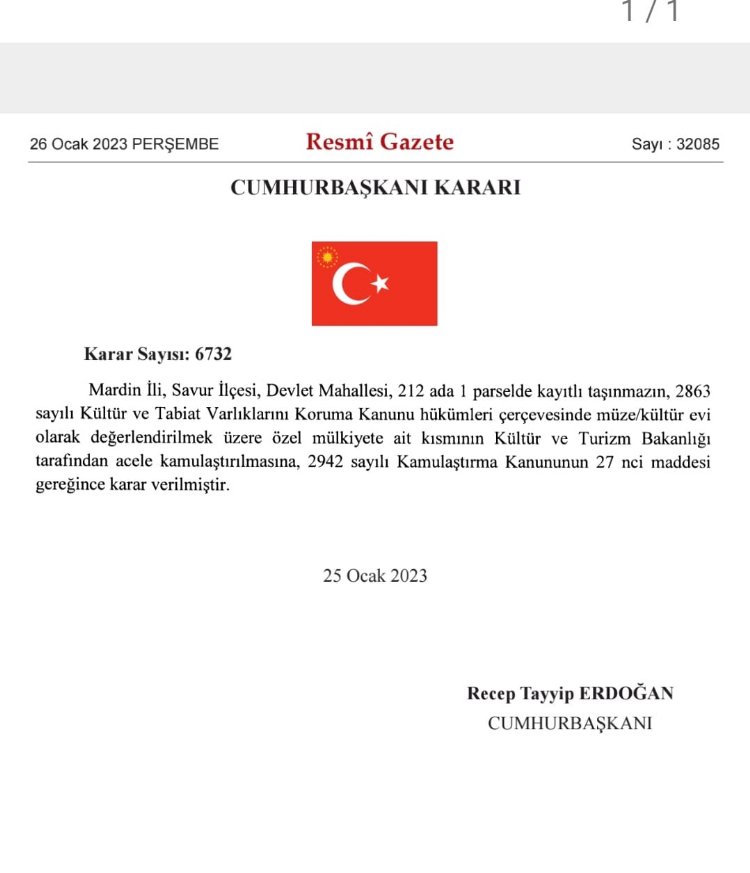 Cumhurbaşkanının Resmi gazetede yayınlanan 6732 sayılı kararında şu ifadelere yer  verildi;  Mardin İli, Savur, Devlet Mahallesi,212 ada 1 parselde kayıtlı taşınmazın,2863 sayılı Kültür ve Tabiat Varlıkları Koruma Kanunu hükümleri çerçevesinde müze, kültür evi olarak değerlendirmek üzere özel mülkiyete ait kısmının Kültür ve Turizm Bakanlığı tarafından acele kamulaştırılmasına, 2492 sayılı Kamulaştırma kanunun 27.ci maddesi gereğince karar verilmiştir” denildi.