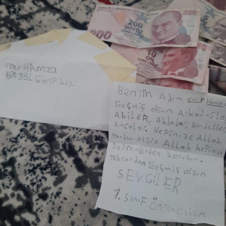 Minik Emir Hamza’nın kendi el yazısı ile yazdığı "Benim adım Emir Hamza. Geçmiş olsun arkadaşlarım, abiler, ablalar, kardeşler, amcalar. Hepinize Allah yardım etsin. Allah hepinizi depremlerden korusun. Çok geçmiş olsun" notu da herkesi duygulandırdı.
