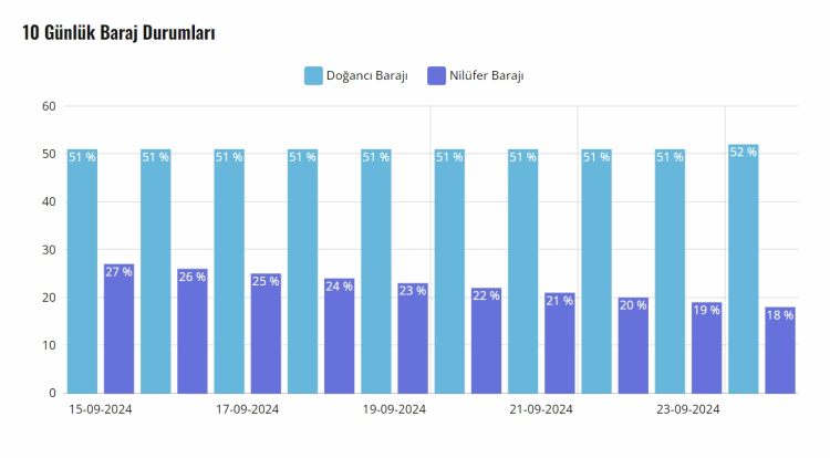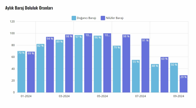 Temmuz ayında Doğancı Barajı, yüzde 55 seviyelerine, Nilüfer Barajı ise yüzde 91 seviyelerine geriledi. Mevsim normallerinin üzerinde seyreden sıcaklıkları ve su kaynaklarının verimli kullanılamaması su seviyelerini adeta dibe getirdi.