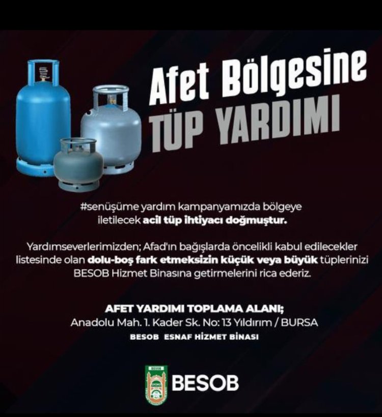 Orhaneli Esnaf ve Sanatkar Odası öncülüğünde başlayan kampanya için Başkan Mümtaz Aslan; “Acılarımız büyüktür. Ülkemiz bu zorlukları birlik ve beraberlik içerisinde aşacağının işaretini vermiştir. Sizlere de esnafımıza da yaptığınız yardımlar için teşekkür ederim. Bölgeden gelen talep üzerine yeni bir kampanya daha başlatarak mutfak tüpü toplamaya başladık" çağrısında bulundu.
