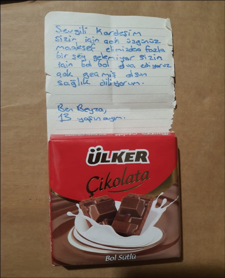 13 yaşındaki Beyza’nın "Elimden bir şey gelmiyor. Sizler için dua ediyorum” diyerek çikolatasını depremzedelerle paylaştığı merhamet dolu küçük paket yürekleri sızlattı.