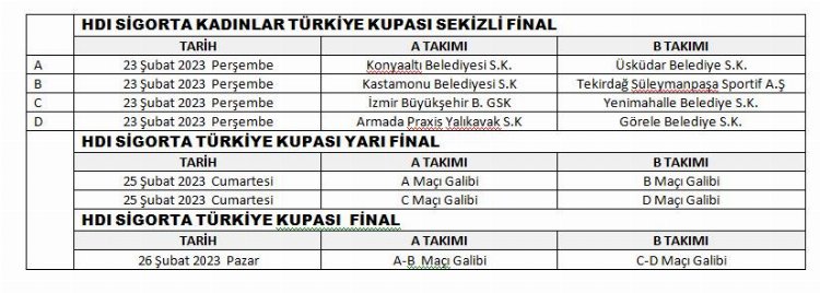 HDI Sigorta Kadınlar Türkiye Kupası’nda Sekizli Final 23-26 Şubat 2023 tarihleri arasında Bolu’da Karaçayır Spor Salonu'nda düzenlenecek. Kastamonu Belediyesi, Armada Praxis Yalıkavak Spor, İzmir Büyükşehir Belediyesi, Konyaaltı Belediyesi, Yenimahalle Belediyesi, Üsküdar Belediyesi, Görele Belediyesi ve Tekirdağ Süleymanpaşa takımlarının mücadele edeceği HDI Sigorta Kadınlar Türkiye Kupası’nda Sekizli Final eşleşmeleri şöyle oluştu: