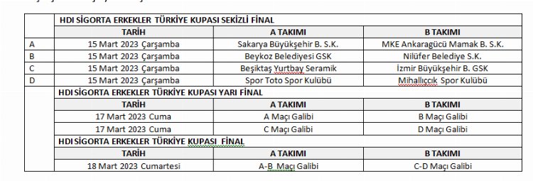 HDI Sigorta Erkekler Türkiye Kupası'nda ise Sekizli Final, 15-18 Mart 2023 tarihleri arasında Konya’da Selçuk Üniversitesi 19 Mayıs Spor Salonu'nda yapılacak.Beşiktaş Yurtbay Seramik, Beykoz Belediye, Spor Toto, Sakarya Büyükşehir Belediyesi, İzmir Büyükşehir Belediyesi, Nilüfer Belediyespor, Mihalıççık Spor Kulübü ve MKE Ankaragücü Mamak Belediyesi'nin mücadele edeceği Sekizli Final eşleşmeleri şöyle oluştu: