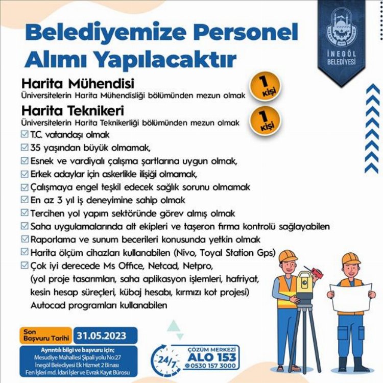 Bursa'da İnegöl Belediyesi, 1 Harita Mühendisi ve 1 Harita Teknikeri olmak üzere 2 personel alımı yapılacağını duyurdu. Son başvuru 31 Mayıs 2023 olarak açıklandı.