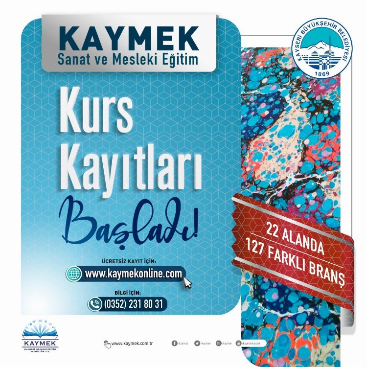 Başvurunun başlamasının ardından 4 bin 38 kişinin kayıt yaptırdığı kurslar, KAYMEK Akademi, KAYMEK Argıncık, KAYMEK Köşk, KAYMEK Sancaktepe, KAYMEK Sümer, Talas Sosyal Yaşam Merkezi (Bahçelievler), KAYMEK TOKİ, KAYMEK Ziyagökalp tesislerinde yüz yüze eğitim şeklinde düzenlenecek.