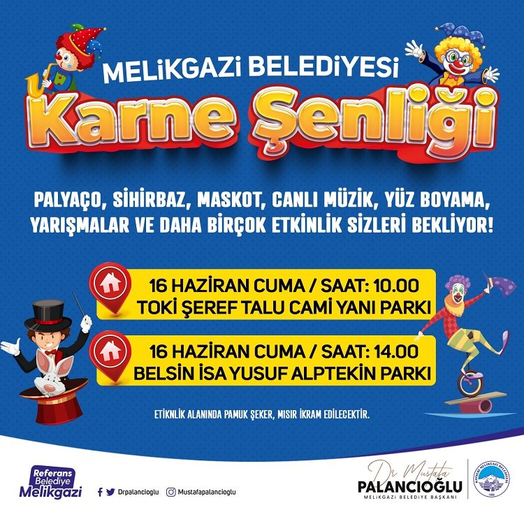 Kayseri Melikgazi Belediye Başkanı Dr. Mustafa Palancıoğlu, bugün İldem ve Belsin bölgesinde gerçekleştirecekleri Karne Şenliği'ne tüm çocukları davet etti.