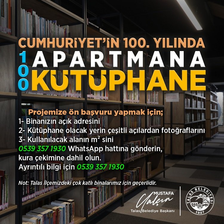 Kayseri'mnin Talas Belediye Başkanı Abdullah Yalçın’ın 100 Ağartan Projeleri arasında yer alan “Cumhuriyetin 100 Yılında 100 Apartmana Kütüphane” projesi çerçevesinde kura ile belirlenecek olan apartmanların bodrum katına ve sığınağına 100 adet kütüphane kurulacak.