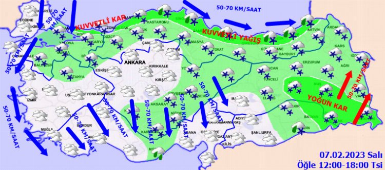 KUVVETLİ VE YOĞUN KAR YAĞIŞI UYARILARI: Yağışların; Karadeniz kıyıları ile Bingöl, Muş, Bitlis, Hakkari, Şırnak, Batman ve Siirt çevrelerinde kuvvetli ve yoğun kar şeklinde olması beklendiğinden ulaşımda aksamalar, buzlanma ve don olayı, tipi şeklinde yağış ve doğu kesimlerin yüksek ve dik yamaçlarında çığ tehlikesi gibi olumsuzluklara karşı dikkatli ve tedbirli olunmalıdır.