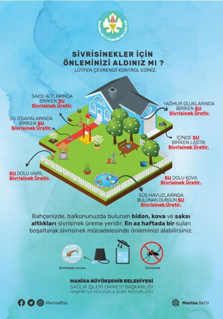 Manisa Büyükşehir Belediyesi Sağlık İşleri Dairesi Başkanlığı, haşereyle mücadele çalışmalarını başlatırken, sivrisineklerin üremelerinin önüne geçmek amacıyla bilgilendirme çalışmalarına da başladı.