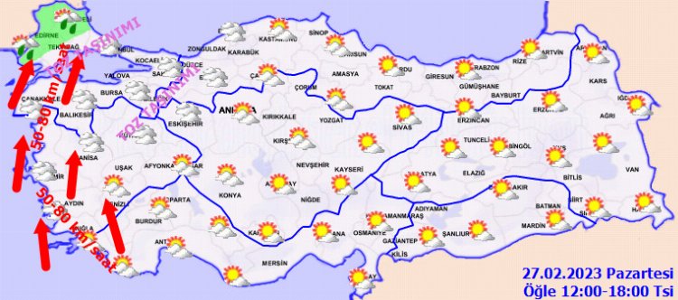 KUVVETLİ RÜZGAR UYARISI: Rüzgârın; Marmara'nın batısı, (Edirne, Kırklareli, Tekirdağ, Çanakkale, Balıkesir'in kuzey ve batısı) Kıyı Ege (İzmir, Aydın ve Muğla illerinin batı kesimleri) güney yönlerden kuvvetli rüzgar ve fırtına (50-80 km/saat, yer yer 90 km/saat)şeklinde esmesi beklendiğinden ulaşımda aksamalar, çatı uçması, soba ve doğal gaz kaynaklı zehirlenmeler gibi olumsuzluklara karşı dikkatli ve tedbirli olunmalıdır.