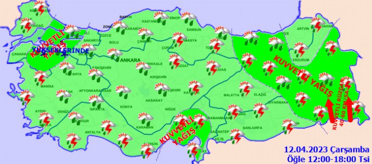 KUVVETLİ YAĞIŞ UYARISI: Yağışların, Doğu Akdeniz, Doğu Anadolu, Güneydoğu Anadolu'nun doğusu ve Doğu Karadeniz ile İstanbul, Balıkesir, Bursa, Yalova ve Kocaeli çevrelerinde yer yer kuvvetli, Bursa'nın 1000 m üzeri kesimlerinde yer yer yoğun karla karışık yağmur ve kar şeklinde olması beklendiğinden ulaşımda aksamalar, sel, su baskını, yıldırım, yerel küçük çaplı dolu yağışı ve yağış anında kuvvetli rüzgâr gibi olumsuzluklara karşı dikkatli ve tedbirli olunması gerekmektedir.