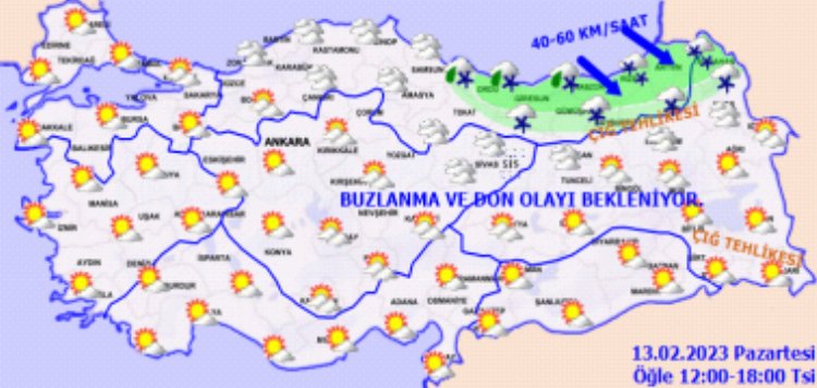 Meteoroloji, Doğu Karadeniz Bölgesi'ne kuvvetli kar yağışı, Marmara ve Ege'ye kuvvetli rüzgar ve fırtına, Doğu Anadolu Bölgesi'ne çığ, İç Anadolu ve Güneydoğu Anadolu'ya don uyarısında bulundu.