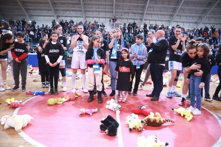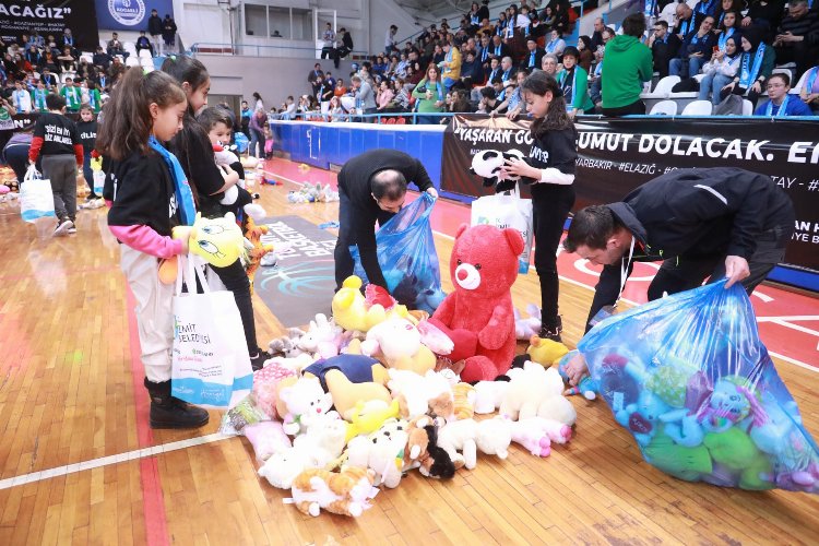 İzmit Belediyespor-Kırklareli Basket maçının devre arasında vatandaşlar, İzmit Belediyesi'nin 'Haydi Maça, Oyuncaklar Sahaya' kampanyasına katılarak depremzede çocuklara destek vermek amacıyla sahaya pelüş oyuncaklar attı.
