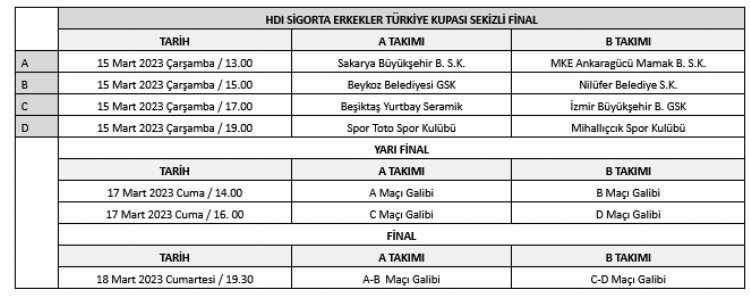 ANKARA (İGFA) - HDI Sigorta Hentbol Erkekler Türkiye Kupası'nda 15-18 Mart 2023 tarihleri arasında Konya’da Selçuklu Belediyesi Uluslararası Spor Salonu'nda yapılacak Sekizli Final maçlarının programı belli oldu.