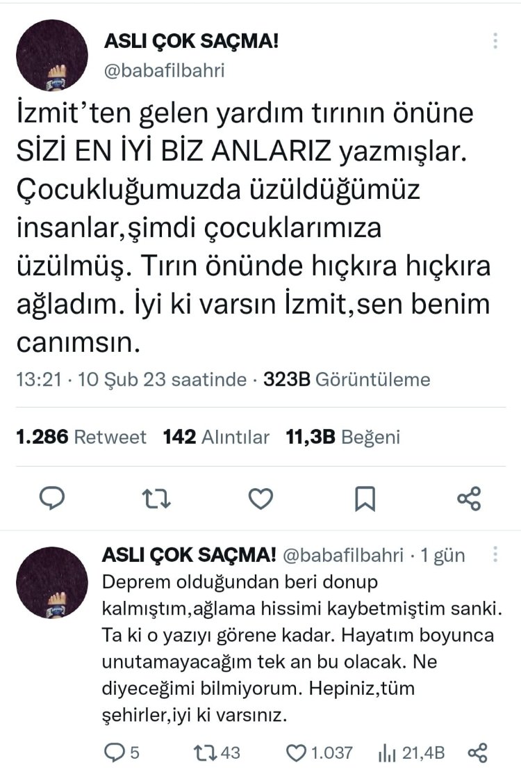 Paylaşımda, “İzmit’ten gelen yardım tırının önüne SİZİ EN İYİ BİZ ANLARIZ yazmışlar. Çocukluğumuzda üzüldüğümüz insanlar, şimdi çocuklarımıza üzülmüş. Tırın önünde hıçkıra hıçkıra ağladım. İyi ki varsın İzmit, sen benim canımsın. Deprem olduğundan beri donup kalmıştım, ağlama hissimi kaybetmiştim sanki. Ta ki o yazıyı görene kadar. Hayatım boyunca unutamayacağım tek an bu olacak. Ne diyeceğimi bilmiyorum. Hepiniz, tüm şehirler, iyi ki varsınız” ifadelerine yer verildi.