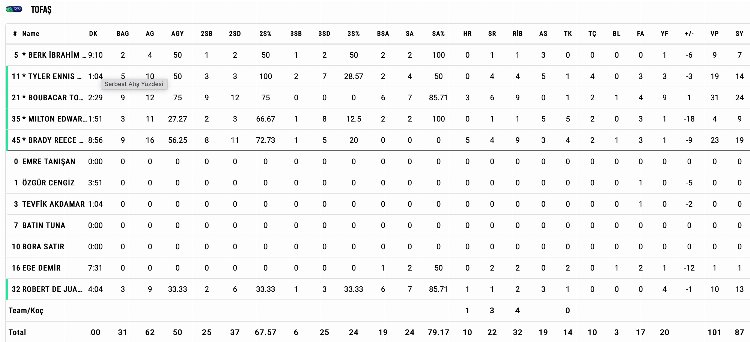 Fenerbahçe Beko karşısında TOFAŞ’ta Boubacar Toure 24 sayı; Brady Manek 19 sayı; Tyler Ennis 14 sayı; Rob Gray 13 sayıyla oynarken; Tolga Geçim ve Berke Büyüktuncel sakatlıkları, Arturas Milaknis de yabancı kontenjanı nedeniyle forma giymedi.