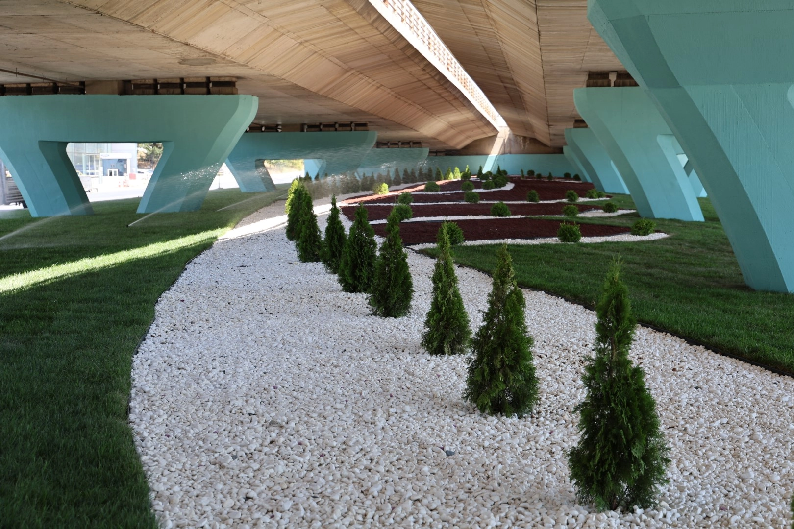 “Piramit Mazı”, “Top Şimşir”, “Phormium Tenax” ve “Loropetalum” gibi bitkilerle alan süslendi.
